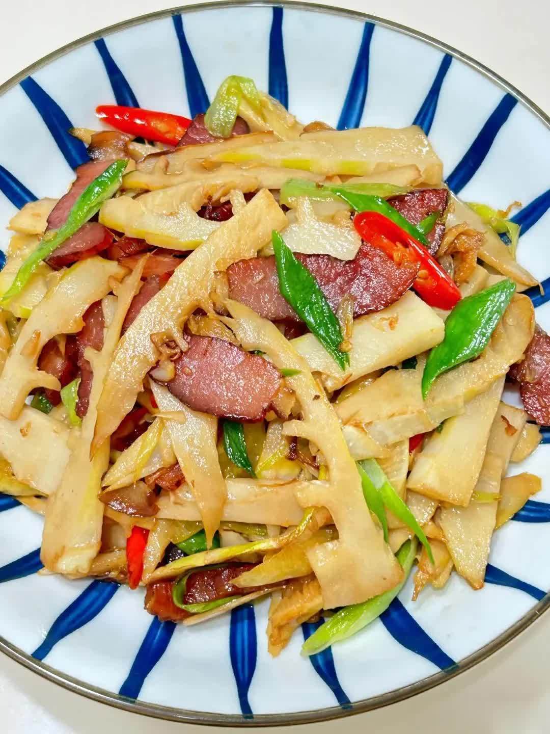 食材:春笋、腊肉、蒜、小米辣、泡椒、蒜苗、生抽、少许盐、味精