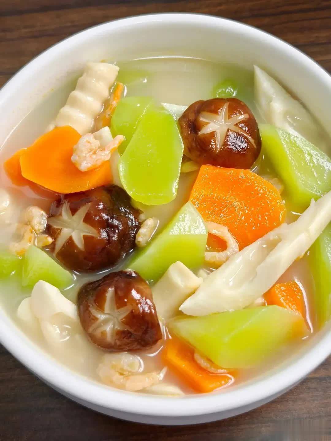 04 三鲜汤✅ 亮点:三鲜汤汇聚了春天的鲜味。莴笋与春笋提供膳食纤维和钾,清春燥、助消化;胡萝卜带来维A;香菇与虾米释放鸟苷酸和肌苷酸,形成天然鲜味叠加。口感上,笋片脆嫩、莴笋清爽、香菇柔韧,汤底清澈回甘,淡而不寡。