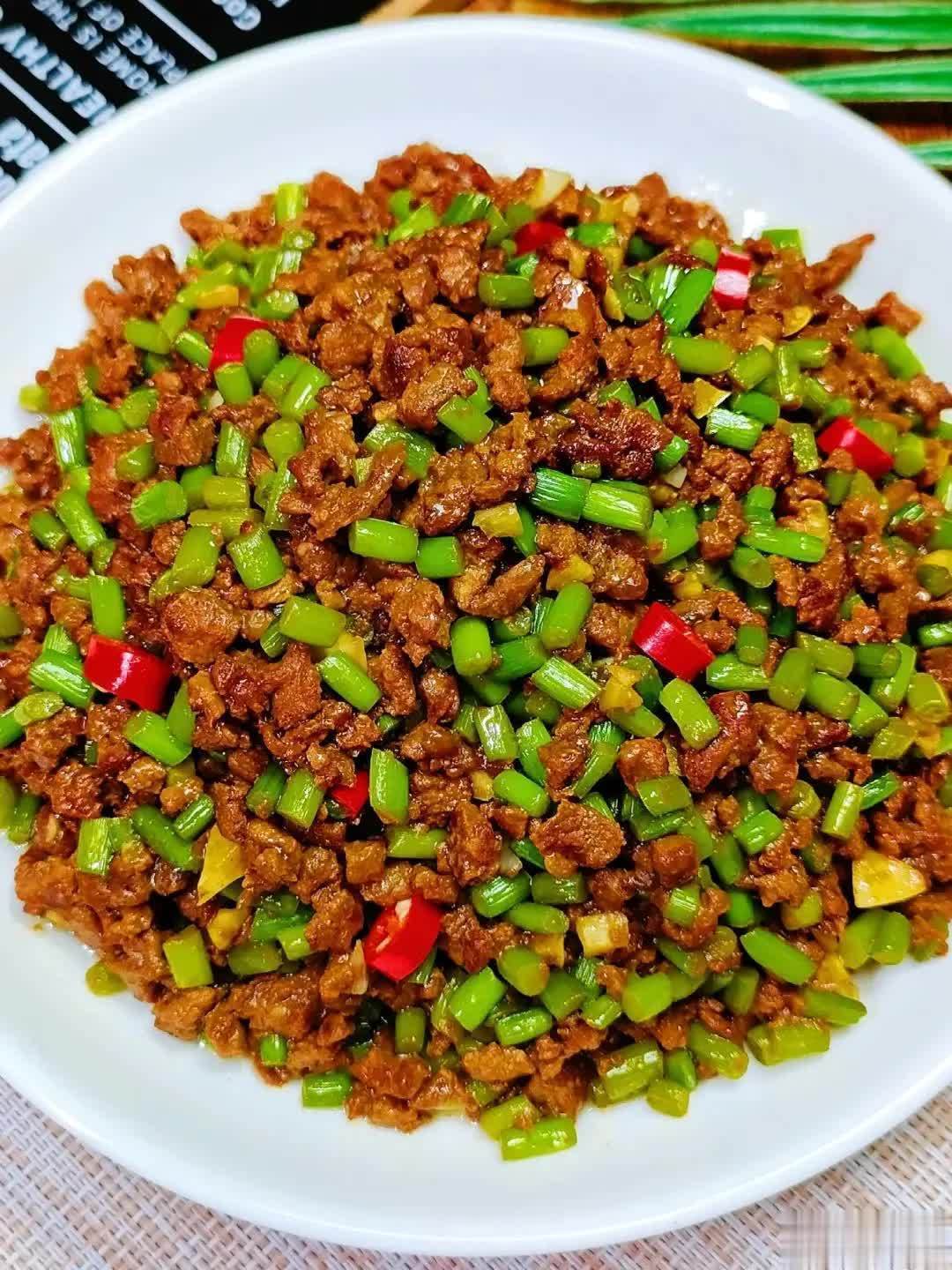 ✅ 亮点:蒜苔炒肉末,营养上互补得当:蒜苔富含大蒜素和膳食纤维,助抗菌、促消化;肉末提供优质蛋白和铁,补体力、防春困。口感绝妙——蒜苔旺火快炒,脆嫩回甜;肉末煸至干香焦黄,油脂与蒜香交融。咸鲜入味,清爽不腻,一筷下去,满口脆香。