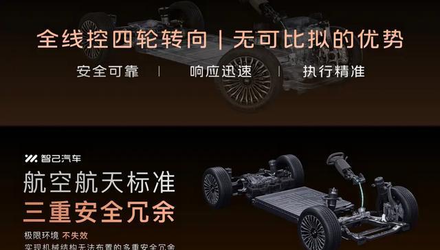 底盘方面,智己LS8搭载灵蜥数字底盘3.0,硬件配备前双叉臂+后多连杆悬架,搭配闭式空气悬架+CDC阻尼减振器,全系标配双向24°四轮转向系统,最小转弯半径仅4.85米,全线控四轮转向支持半圈打满,方向盘行程多档可调,兼顾了城市代步的灵活性与高速行驶的稳定性。