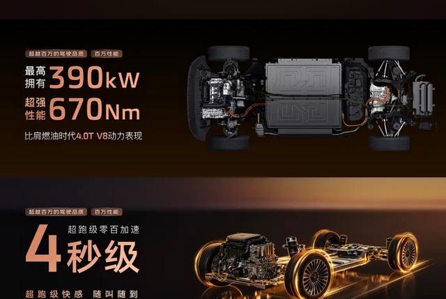 动力部分,新车全系搭载1.5T“恒星”超级增程动力系统,系统综合最大功率390kW,峰值扭矩670Nm,匹配宁德时代磷酸铁锂电池,CLTC工况纯电续航430km,综合续航里程可达1605km,同时配备800V超快充平台,30%-80%快充仅需12分钟,0-100km/h加速为4秒级,在续航补能与性能之间做到了平衡。