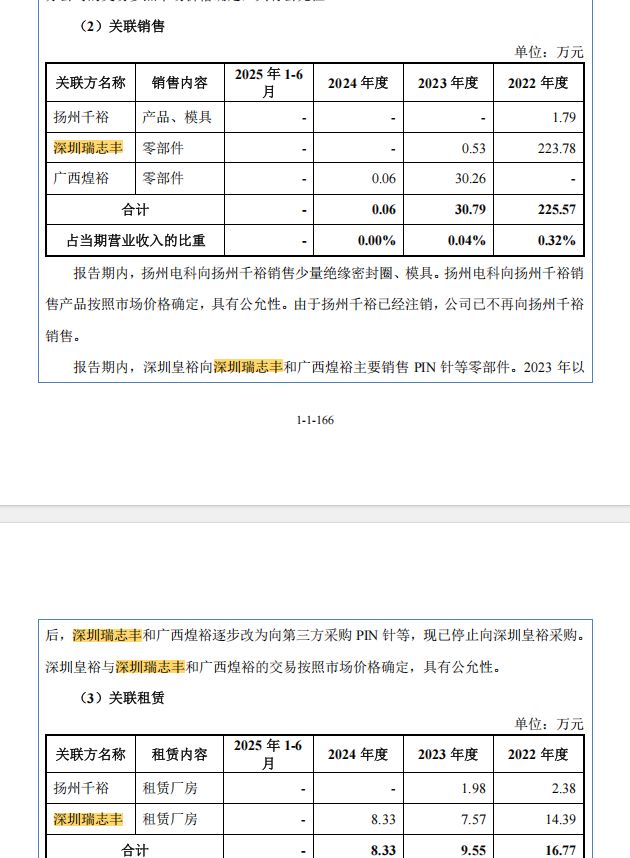 报告期内,皇裕精密及子公司曾向实控人控制的深圳瑞志丰、广西煌裕采购成品、销售零部件、租赁厂房,甚至出售少量机器设备。这两家企业后来被转让给无关联第三方。